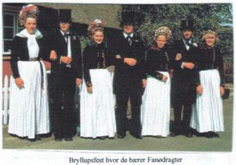I sammenligning med folkedragter fra mange andre egne i Danmark, kan man vel ikke sige, at fanødragten virker prangende, og så er det endda mest søndags eller brudedragten der bliver vist på de billeder folk kender bedst, det de havde på til hverdag var endnu mindre farverigt. Men det passede til deres mentalitet, beskedne og sparsommelige som de var. |