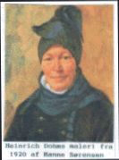 | Men det var skørterne der dominerede fanødragten, hvor mange de gik med var vel afhængig af forholdene, men som regel var det mere end et, hvor det yderste var med fine plicerede læg, og farvede kantbånd, som regel grønne (hvis det da ikke var enkedragten de bar). De gik altid med forklæde, til hverdag et af almindeligt bomuld, men når de rigtigt skulle pyntes, kunne det være af det fineste silke. | |