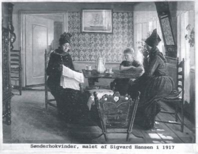 Billedet viser et typisk Sønderho hjem med søndagsklædte kvinder, og med en væg fuld af såkaldte hollandske fliser. Disse blev til at begynde med bragt hjem af søfolkene når de for hjemgående manglede ballast, men da de opdagede at det var en salgsvare kom de i større mængder. |